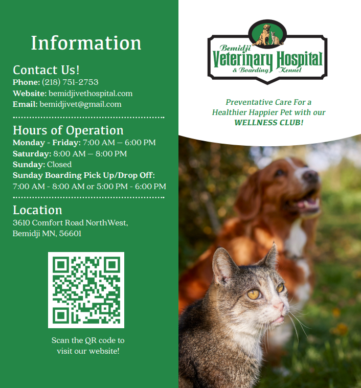 During a wellness exam, your veterinarian will evaluate key aspects of your pets health, like vaccinations, parasite prevention, dental health, and nutrition. The Bemidji Veterinary Hospital and Boarding Kennel team is here to help your pet live a happy and healthy life!